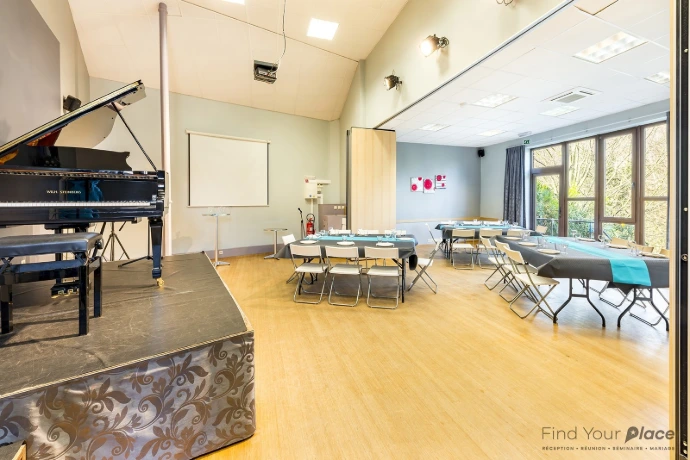 Cette salle a été conçue pour pouvoir également être louée aux familles lors de fêtes : anniversaires, baptêmes, mariages, communions, fêtes laïques, etc.